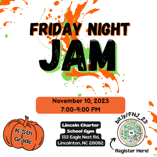 Friday Night Jam is a dance designated for Kindergarten-5th graders. Children are invited to join us at Lincoln Charter School on November 10 dressed in fall attire. Parents can check their child in at 7 pm and pick them up promptly at 9 pm. This is a great opportunity for parents to enjoy a date night or get some early Christmas shopping done.