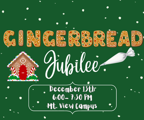 CCKids presents Gingerbread Jubilee, a free, family fun night! Come join us on December 13 from 6 -7:30 p.m. at the Mt. View Campus! Families will enjoy a devotion during a provided meal, make a gingerbread house together, and create lasting memories!