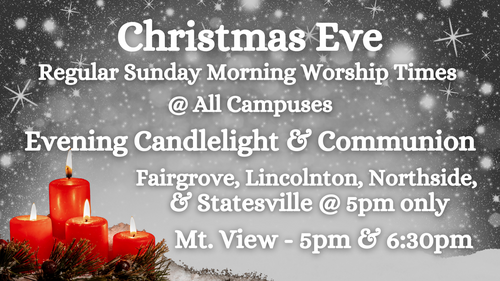More Good News—Sunday morning December 24th worship services will have different music, different sermon and CCKids ministry operating during the morning worship services. December 24th evening services is Candlelight, Communion and Christmas Carols for all campuses. Please invite friends, coworkers, and family to attend. Check the CC app or website for worship times at christnc.com
