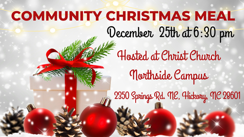 Christ Church will host the Community Christmas meal at the Northside Campus - Monday, December 25 from 6:15-7:30 PM. in conjunction with Celebrate Recovery. We estimate we will be serving approximately 156 guests at their tables and we need your help.