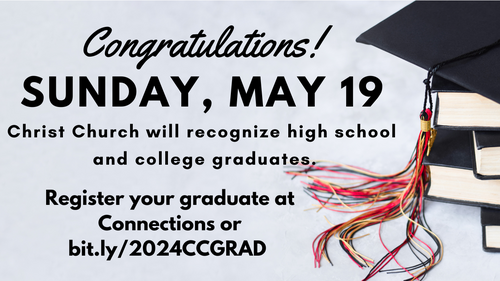 - Recognition of Graduates on May 19 at all of our campuses. If you have a graduate in high school or college let us know by registering them at bit.ly/2024CCGRAD.