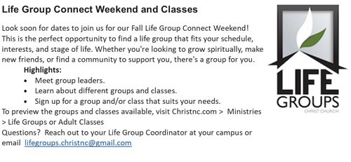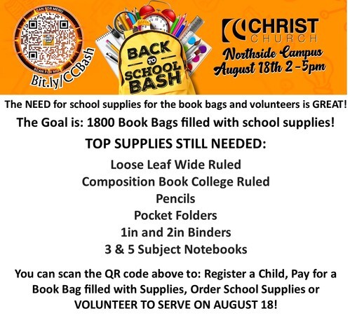 - Back to School Bash—August 18 from 2-5pm at our Northside Campus. Our goal is to give 1800 backpacks full of school supplies to meet the needs of kids and students. You can still order online to purchase supplies and to sign up to volunteer. Click the link bit.ly/CCBash or go to our website christnc.com
