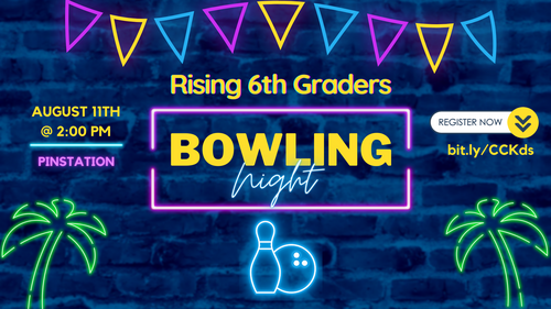 Rising 6th Graders will be moving from Children's Ministry into Student Ministry on Sunday, August 11th. As they make this exciting transition, we want them to be able to connect with their fellow rising 6th graders and celebrate by going bowling together. For more details and to register, visit bit.ly/CCKds