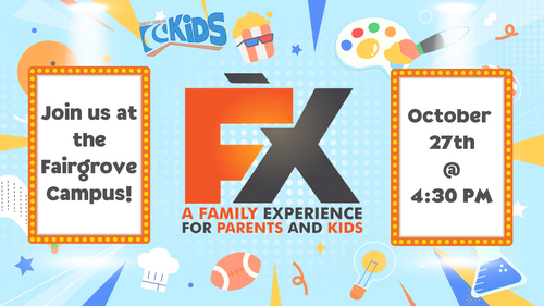 Save the Date! CCKids will be hosting another Family Experience (FX) at the Fairgrove Campus on October 27 @ 4:30 PM. FX is an engaging live event where parents and kids experience music, laughter, and fun teaching about the character of God together. The FX will align and reinforce what your children will be learning in CCKids during the month of October. Your family will also be sent home with devotions to complete together. You don’t want to miss this!