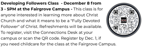 - A Developing Followers Class will take place this Sunday, December 8 at 3pm at the Fairgrove Campus. If you haven’t joined Christ Church we would love for you to take this informative class to be a part of the CC family.