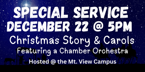 Christmas Story and Carols Sunday, December 22 at 5:00PM at the Mt. View Campus: All Campuses are coming together to worship the Christ-Child with Lessons from Scripture and Traditional Christmas Carols: