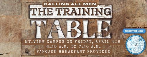 - Friday, April 4, the Training Table for men at the Mt. View Campus from 6:30AM-7:30AM, please register online as we want to have plenty of breakfast prepared at no charge. Click this link to register.