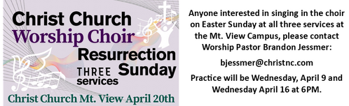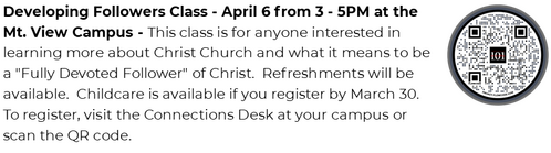 - Developing Followers Class: Sunday, April 6, 3PM at Mt. View Campus to learn more what Christ Church believes and how we live it out. This is a required class if you would like to join the Christ Church family. Pastor Charles and staff lead this class.