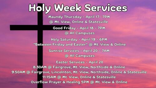 - Maundy Thursday Service, April 17 at 7PM at Mt. View and Statesville campuses & online